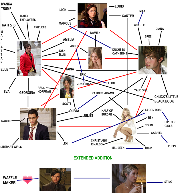 And of course, no love web would be complete without a scoring of the characters. They’re classy like that. The top male, who comes out with 15 connections (though some are with multiple people), is Chuck Bass, to no one’s surprise. Close behind him is all-my-storylines-revolve-around-females-Nate, who manages 12 connections with his Natefused good looks. Dan comes out with 8. Next time champ. For the girls, we have Serena rounding it off at number one, obviously. She gets rowdy in the summertime. Then we have Blair, who actually beat Vanessa (7) by one point. Princess B indeed. And then Jenny gets thrown in there somehow. She was a beard. It’s whatever.