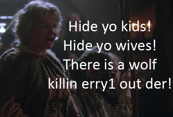 Back in fairytale land, they are trying to form another group of men to go against the wolf. Snow notices Red smiling and making eye contact with Peter. Then, Granny steps in and is basically like, “You can’t defeat the wolf so just hide. I know this because my brothers and father died trying to defeat him. The wolf even bit me!” and she shows her scar on her arm. Somehow this gets through to the men and they are scared. Later, Red tells “Mary” about how she feels trapped because of Granny being overprotective with the wolf thing. “Mary” asks if this trap is keeping her from someone and Red was all like, “HOW DID YOU KNOW?!”. Red asks “Mary” if she has anybody and she says she isn’t sure it is in her future. Pre-Charming, I see. So Red suggests they kill the wolf so she can be with Peter. This is obviously the perfect plan and nobody has ever tried it before. Silly girls. So they go out and search for the wolf. They soon find out the prints in the snow go from wolf prints to boot prints. Then they see the tracks go all the way to the cottage to Red’s window. This could only mean one thing. Peter is the wolf. Snow tells her that she has to tell Peter. So Snow and Red switch hoods, so that Red can sneak off and Snow can cover for her. It is the perfect plan. But Granny finds out that Snow was pretending to be Red. Granny is upset and asks where she is. Snow tells her its okay. Peter is the wolf, but don’t worry! Red is just going to tie him up. It is the perfect plan.