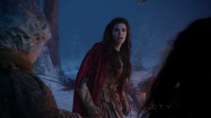 In fairytale land, Granny has told Snow about Red being the wolf and how it is genetic! DUN DUN DUN. They quickly look for Red and when they find her, it is too late. She already turned into the wolf and ate the one she loves. Talk about forbidden love. Granny tells Snow to quickly give her the hood and she covers the wolf with it. Turns out the hood is magical and it keeps Red from turning into the wolf. Red is back to herself and quickly sees dead Peter and finds out she is the wolf. She is in complete shock. The men that are seeking the wolf is starting to get close and Granny tells Red she has to leave. Red can’t move due to the shock and finally Snow starts to guide her.