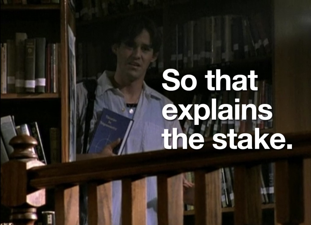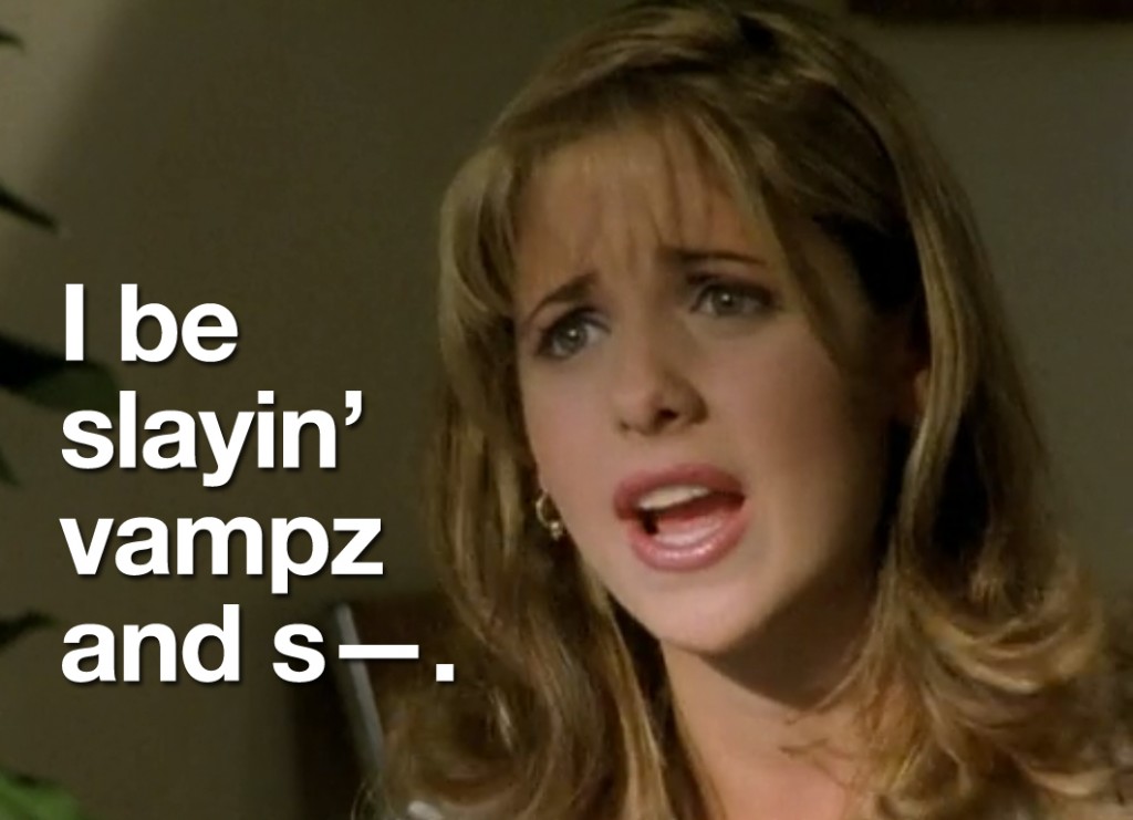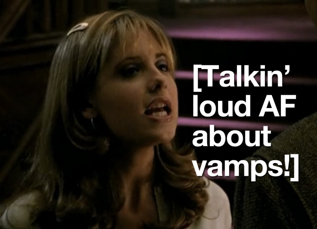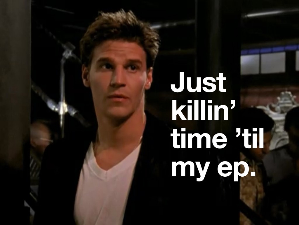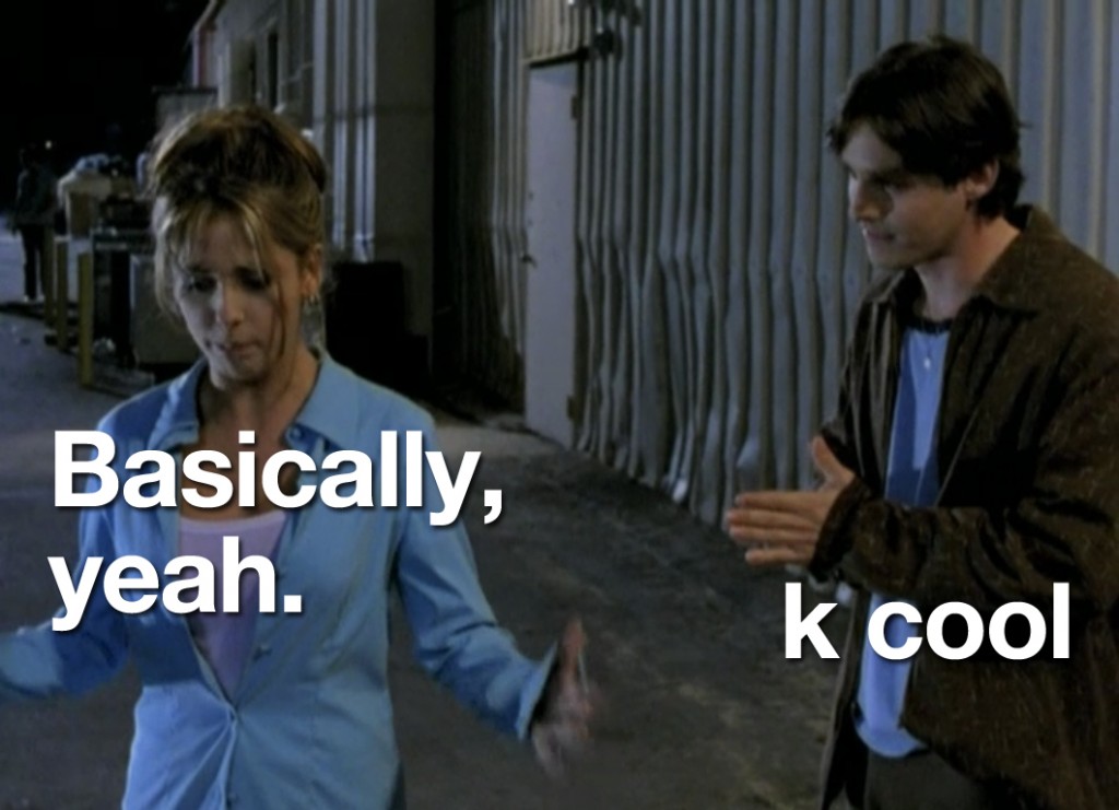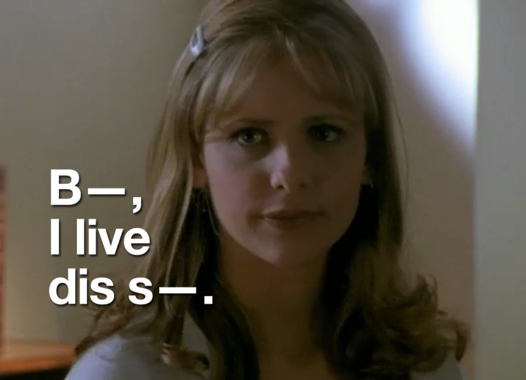 So the first thing I’ve learned this weekend is that a lot of people like Buffy the Vampire Slayer and the second thing I’ve learned is that people who like Buffy the Vampire Slayer generally don’t mix well with people who observe oddities in Buffy the Vampire Slayer. The third thing I learned is that, then in turn, a lot of people don’t like me. Needless to say, I was sort of getting used to people who were just on this site and knew what my sense of humor was…but now there are new people, and they simply do not get it. So now I have to, like, “think” and “delve deeper.” Exhausting.