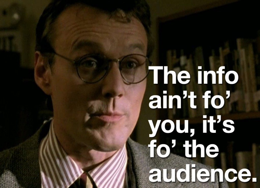 He’s the watcher. Every generation has a slayer, the woman who is destined to kill evil, and has a watcher, the man who is supposed to guide and train her. He’s basically like a VERY pushy friend who knows everything about everything. He’s the Wilma to Buffy’s Daphne. In fact, I’m almost convinced that Sarah Michelle Gellar took this role just to do an in-depth character study for Scooby-Doo.