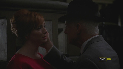 Joan: “All you’ve done is prove to them that I’m a meaningless secretary and you’re a humorless bitch.”When Lane’s father first showed up in “Hands & Knees,” he didn’t bother me much. He wanted to bring back his son to his family in Britain. He was a stern father you could tell. But then he found out he was dating an African-American Playboy Club waitress, and he hit him on the head with a cane.. and stepped on his hand until Lane said, “yes, sir.” It was scary and shocking. I’ve seen parents hit their children on this show, but they never wear grown children.