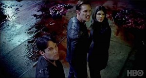 Last season in Bon Temps we were left with the horrifying image of Sookie holding Tara’s head together. This season opened with Sookie and Lafayette holding Tara in what looks like a war zone. Pam arrives at Sookie’s to search for Eric, only to find Lafayette, Sookie, and half-head Tara. Sookie and Lafayette convince Pam to try and change Tara and she eventually agrees. Not without putting up a fight though. “If you can use your magic hands or your super snatch or whatever power it is you have,” Pam says about how Sookie can repay her. I literally laughed out loud. Got to love Pam.