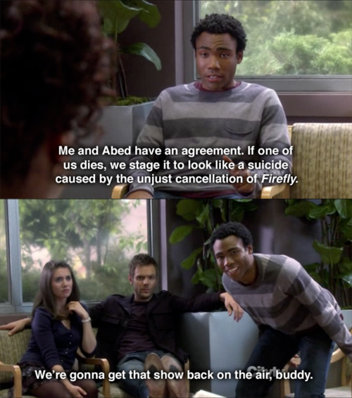 Oh and Fox, you’re horrible. Actually, horrible is an understatement. One season was not at all enough. When I finished watching the series finale, I wanted to email FOX and tell them what awful human beings they are. They had a hidden gem and they RUINED it. There should be a network just dedicated to cult hits: Firefly, Community, and the likes. It would be a perfect perfect world.