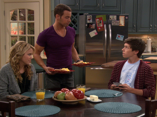 Panicked, Mel rushes upstairs and interrupts Joe’s regular programming to bring him the breaking news. If there was ever a time for Joe to be gratuitously shirtless, it would be this moment, which is why it makes no sense to me that he’s getting his massage while fully clothed. They can make sex jokes left and right, but partial male nudity is where they draw the line, even though Joe and countless other ABC Family hunks have gone topless in the past. Regardless, Mel takes a note from Ratatouille and decides to use video chat to get live cooking instruction from Joe.