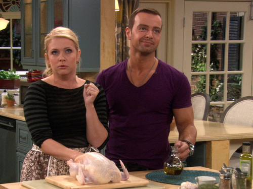 Back at home, Joe gets started on dinner while Mel “works” on her laptop, but she’s really watching a movie. I swear, this episode was like a snapshot of my own home, except watching stuff really is my “work.” As though they don’t have cable TV (Helloooo, Food Network?) Mel tells Joe that she needs to watch the Disney flick to learn how to cook. She then begs him to show her how to cook a dish for Travis and he agrees after some light groveling. During Mel’s cooking lesson with Joe, he shows her how to prepare a meal out of a whole chicken, which completely disgusts Mel. He has her rub the chicken down, and she makes a joke that I didn’t get until the end of the episode because it was massage humor, not “chicken humor.”