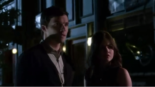 The next day, Aria and Ezra are leaving a coffee shop and it seems like Aria bought a little more than she should for Ezra and he gets a little offended because she was “feeding” him. Apparently he has one lime on his fridge that is growing fur. Even though I laughed at this and thought Ezra had the right to be a little offended, I get Aria, she was just trying to help him. Then, when she’s getting in the car to get a ride from Ezra, she sees Lucas being kicked out of a building, asking to get in there again and to get his stuff back. Oh, Lucas, where has the sweet boy we all loved gone to?