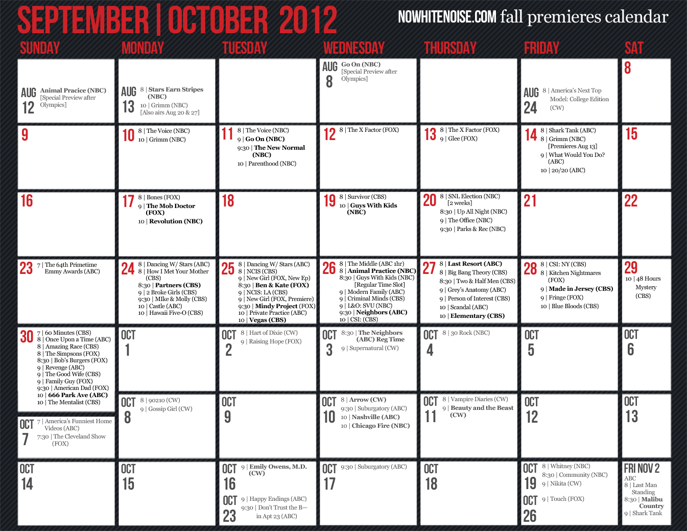The fall season is approaching. Actually, it’s already here. NBC’s premiering Go On tonight. Yes, tonight. And next week is Grimm‘s premiere. A week later? America’s Next Top Model. Don’t get too excited, because this season’s broadcast networks’ premiere dates are spread across all the way until NOVEMBER. How can you keep track of all of them?