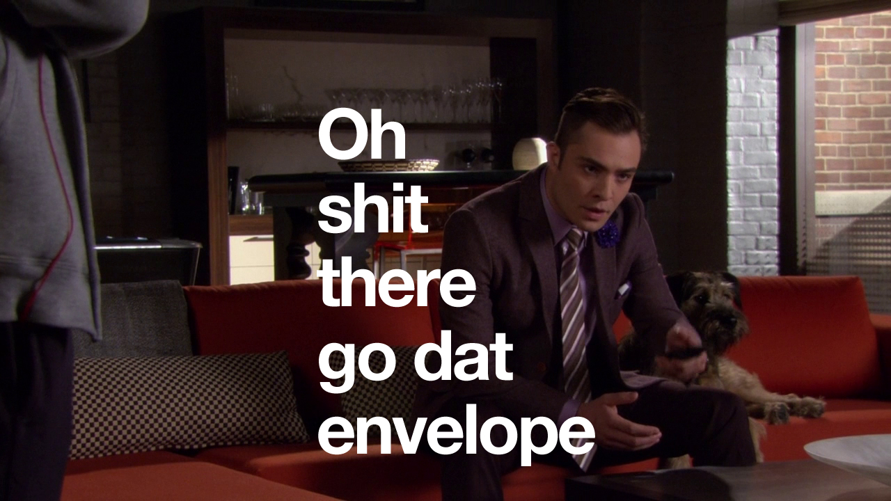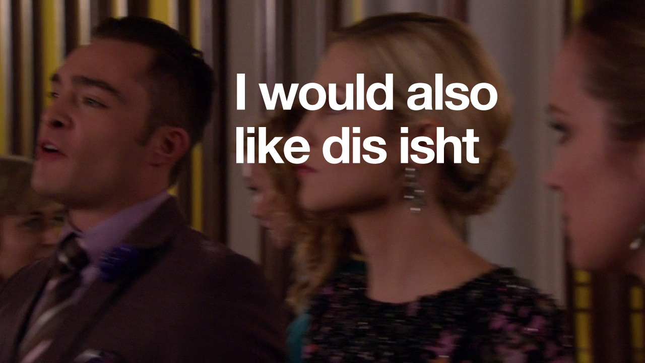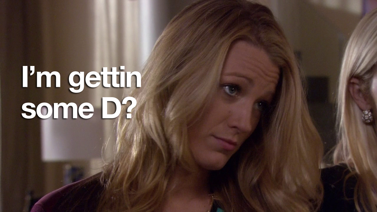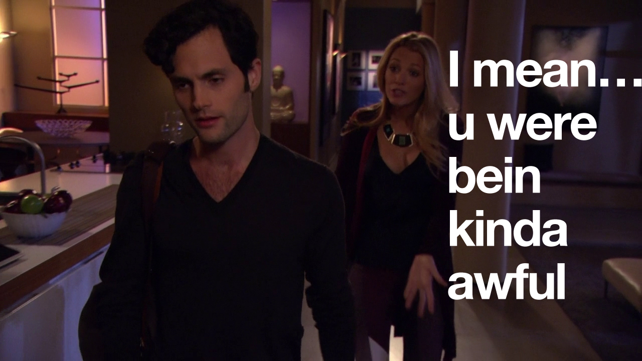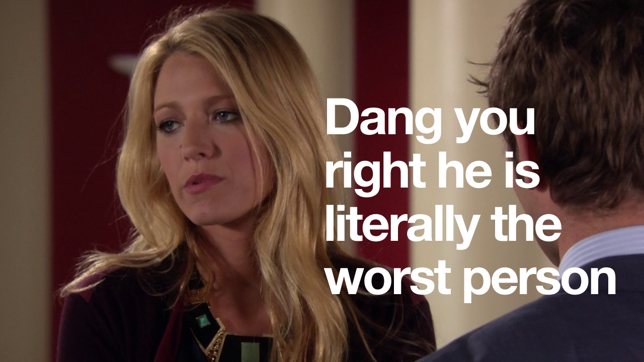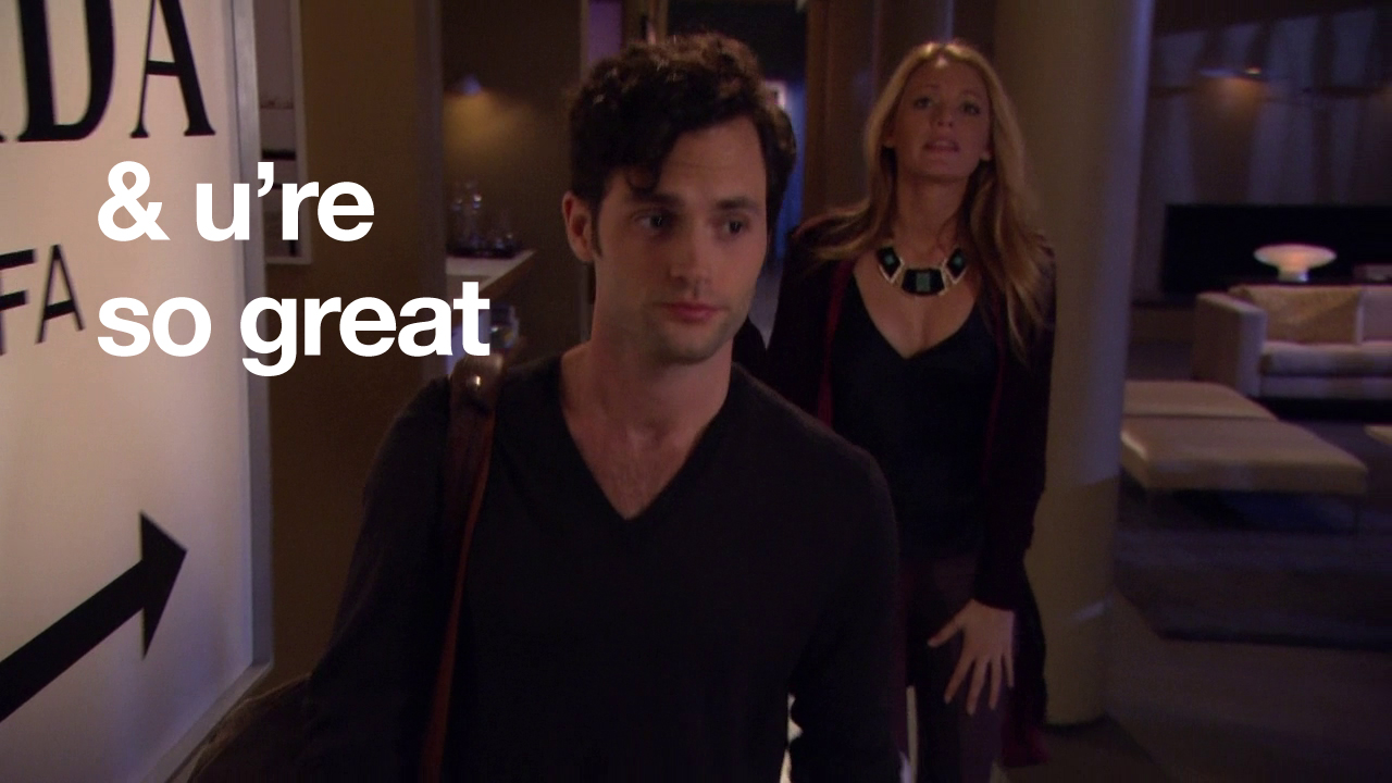 In this episode, Ivy and Rufus spend all of their money making Lily huff and puff and blow your house down! Chuck and Nate are doing math, which is just a bad sign if Nate’s doing math. Blair is trying to defeat the Dark Side – but can’t understand common courtesy at all. And Serena and Dan get it in. Remember two episodes when they hated each other? Me neither.