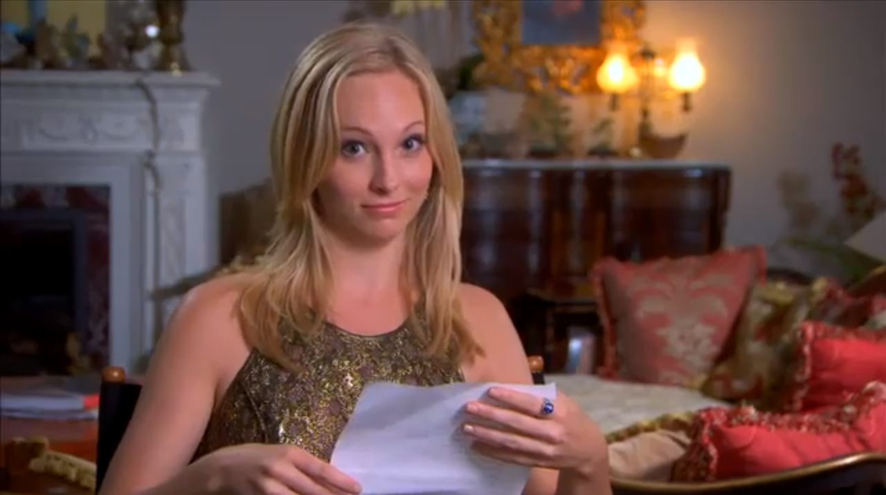 Nina gets to read a piece from an Elaric story; Candice gets a sultry Rebekoline story; Michael gets a romantic Tylena, and Zach gets a peek at the possible romance between Matt and Katherine.