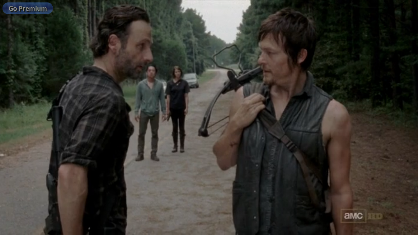Here is what I pieced together from the “Previously on The Walking Dead”: Team Prison has migrated to a rundown prison where they have lived comfortably until a new group of people have shown up (the couple and two men or a.k.a Team Tyrese); Maggie was (I’m assuming sexually) assaulted by the Governor and Glenn was tortured by good ol’ Merle for info on their prison whereabouts; some of the group tries to rescue them when Daryl gets left behind; Michonne guts the Governor’s eye out; and finally, Daryl and Merle are put to a fight to the death against each other.