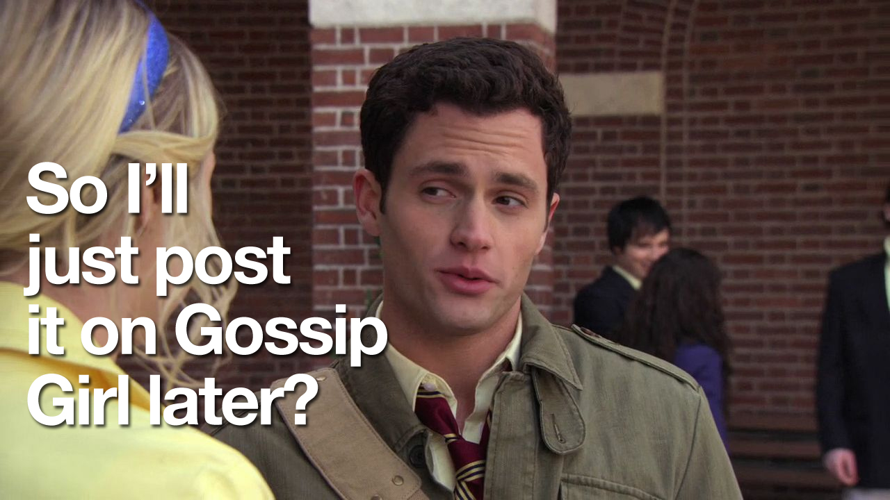 I decided to surprise everyone with a quick vintage photo recap of cap-worthy episode 1×16 “All About My Brother” — except a quarter way in, I realized that neither Chuck nor Nate were in the episode … which is just sad. I wanted some Natefused and Rihanna lyrics in here, but it didn’t happen. However, I chose it because I remembered it had one of the most complicated scenes ever, given that (SPOILERS IF YOU HAVEN’T WATCHED THE SERIES FINALE OR BEEN ON THE INTERNET AT ALL) Dan is Gossip Girl.