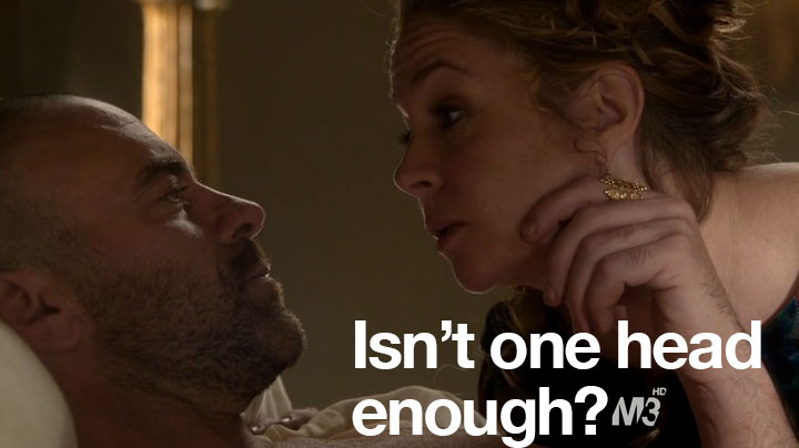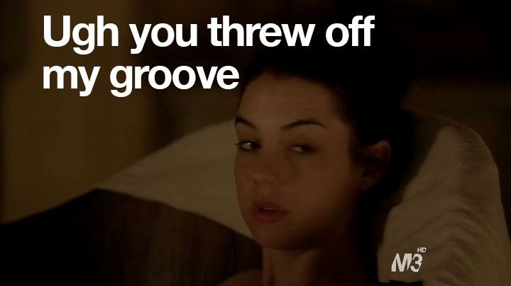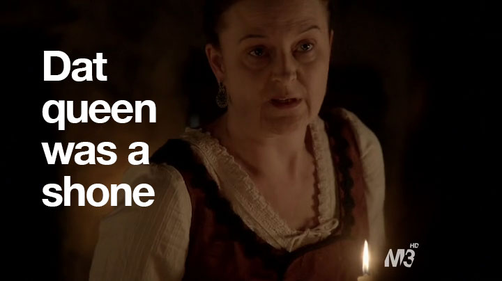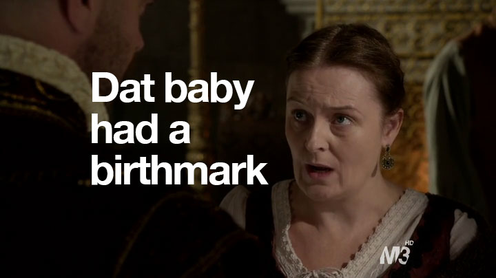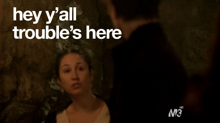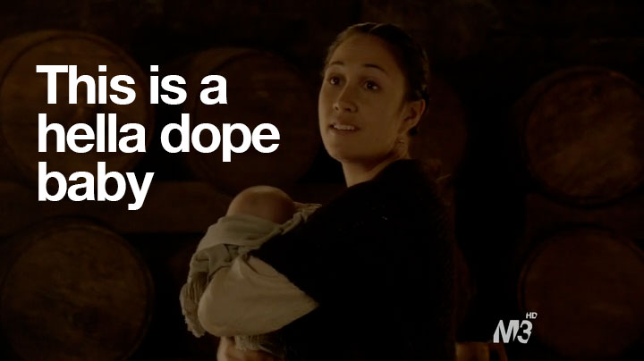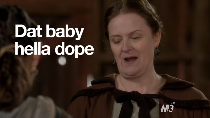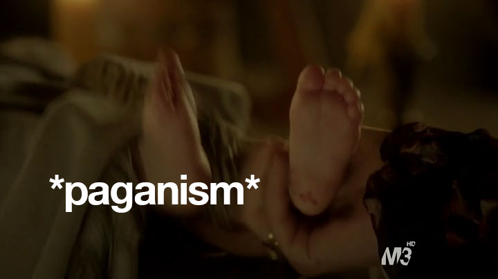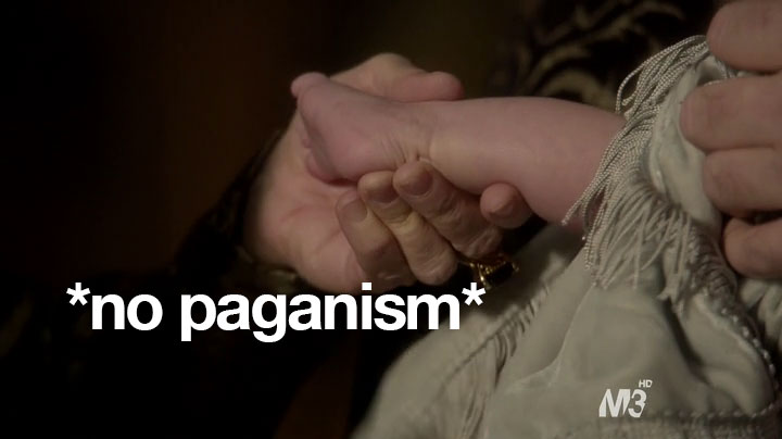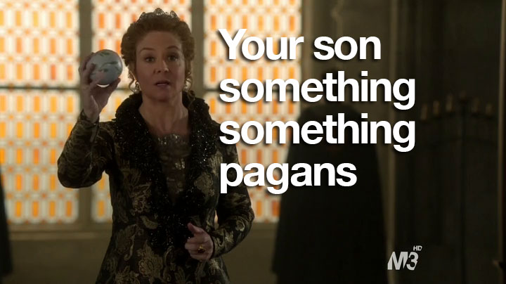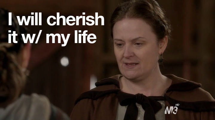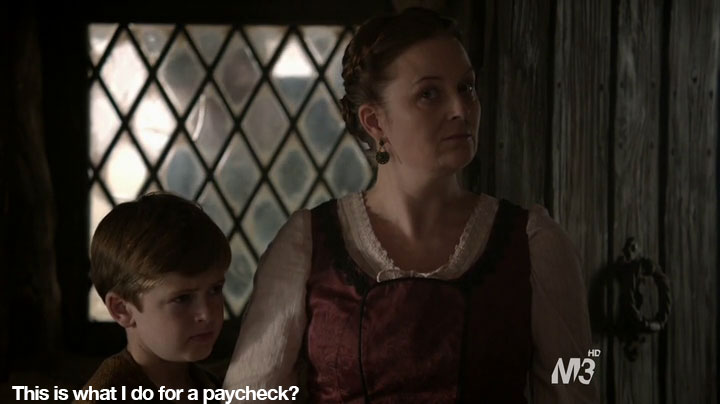 So, anyway, sorry about no recap last time. You didn’t miss much. Basically, I was going to make Paganism a euphemism for something else and a shot of Mary and Son #1 kissing with the caption: “We need mops.” High-brow-type humor, you know. But in case you didn’t watch the previous episode, what happened was that Son #1 had a cousin who had a baby and now he and Mary have to hide him. In this episode, they check in on the lady who they have taking care of the baby. And this lady just loves this job.